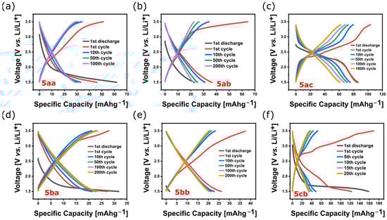 Galvanostatic charge/discharge curves of compounds of the polymers (a) 5aa, (b) 5ab, (c) 5ac, (d) 5ba, (e) 5bb, and (f) 5cb.