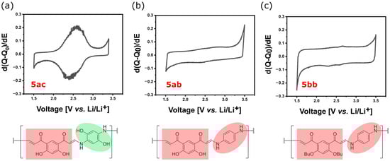 Polyenaminones 5aa, 5ab, 5ac, 5ba, 5bb, and 5cb were electrochemically characterized in a Li electrolyte to probe their redox activity, which is also the starting point for the development of other monovalent (Na, Li, K) and multivalent (Mg, Ca, Al) batteries [9]. Specifically, we aimed to elucidate the potential redox-active centers of 5ac, 5ab, and 5bb. Polymer 5ac has three possible redox-active centers: hydroquinone, resorcinol, and conjugated carbonyl. In contrast, 5ab contains only resorcinol and conjugated carbonyl, while 5bb has only conjugated carbonyl. Despite these differences, the basic backbone structure of the polymers is quite similar.