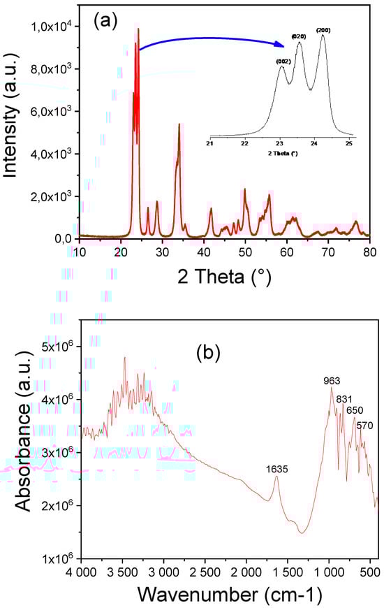Figure 1b presents the Fourier-transform infrared (FTIR) spectra of WO3 particles. The FTIR spectra of WO3 particles can be divided into three distinct zones: a broad band at 3200–3600 cm−1, a peak at 1635 cm−1, and a third zone comprising narrow peaks between 570 and 960 cm−1. The bands at around 3467 cm−1 are attributed to the O-H stretching mode due to adsorbed water molecules. The peak at 1635 cm−1 is associated with the H-O-H bending vibration mode []. The band at 963 cm−1 corresponds to the asymmetric stretching vibrations of W=O bonds [,]. Furthermore, the narrow peaks between 650 and 831 cm−1 are assigned to the (W-O-W) and (O-W-O) stretching vibrations of bridging oxygen and tungsten, respectively [,].
