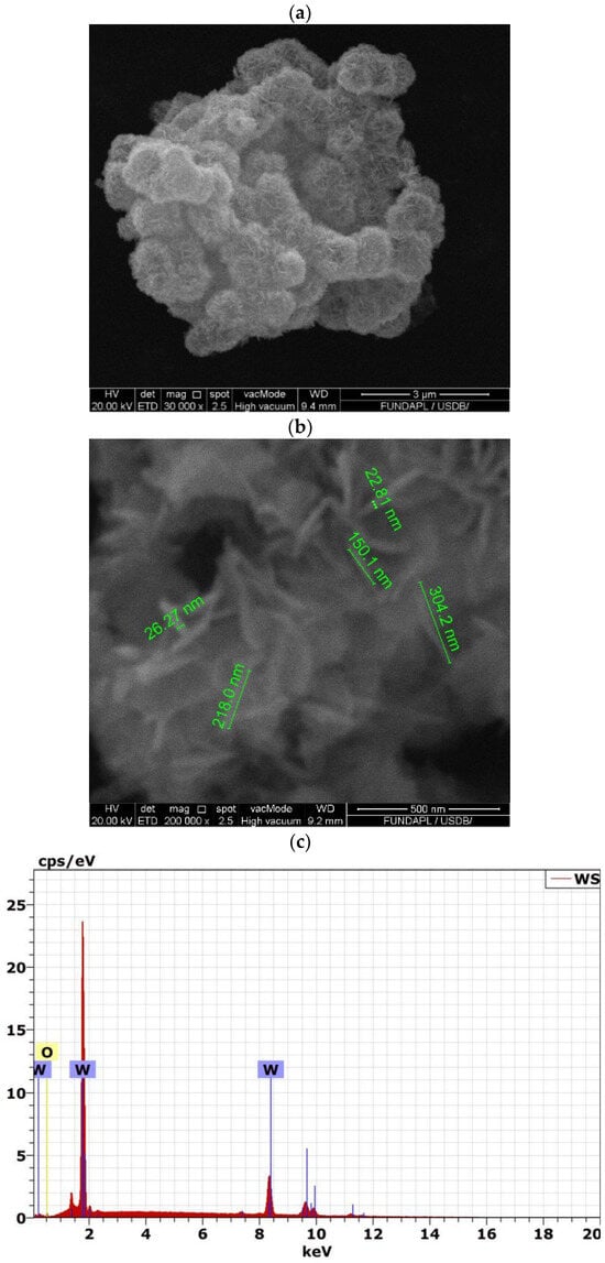 SEM analysis of the urchin-like WO3 particles: (a,b) SEM images; (c) EDX-SEM analysis.