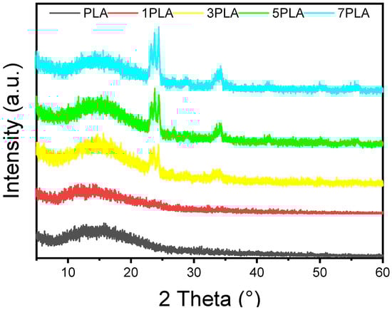 XRD spectra of neat PLA and PLA/WO3 nanocomposites loaded with different loadings of the urchin-like WO3 particles (1 wt%, 3 wt%, 5 wt%, and 7 wt%).