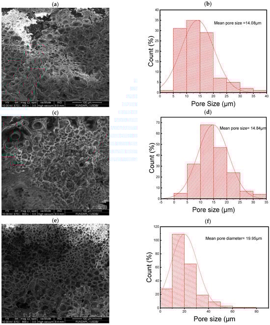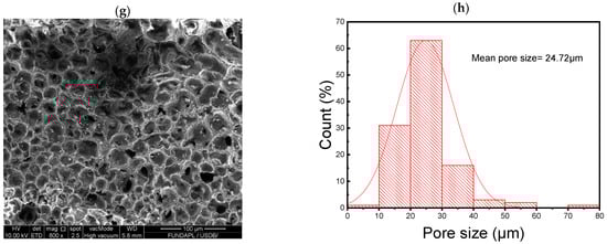 SEM cross-section images illustrating the irregular honeycomb-like morphology of PLA/WO3 nanocomposites with different urchin-like WO3 particle loading with pore size distribution: (a,b) 1 wt%, (c,d) 3 wt%, (e,f) 5 wt%, and (g,h) 7 wt%.