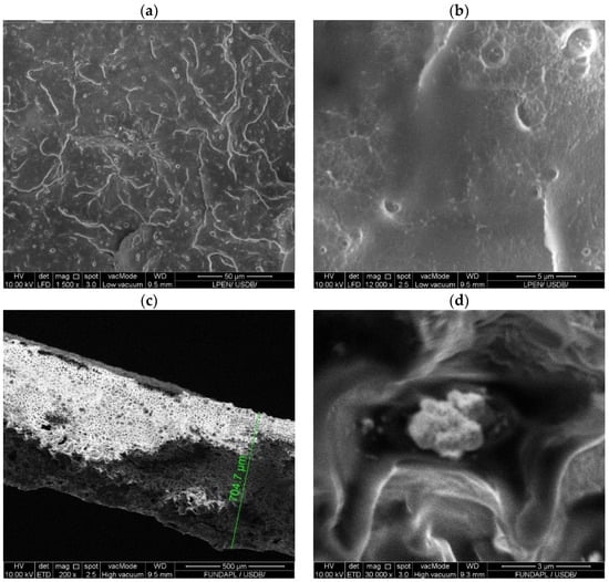 Scanning Electron Microscopy (Quanta 650, FEI, Hillsboro, OR, USA) operating at an acceleration voltage of 10 kV was employed to analyze the particle size and morphology of WO3 powder, pure PLA after solution casting, and PLA/WO3 nanocomposites. The WO3 powder was directly mounted on the SEM sample holder to capture its native morphology without additional treatment. For the PLA and PLA/WO3 nanocomposites, the films were spread on petri dishes, dried completely, and stored at −10 °C for 12 h to facilitate cryofracturing, ensuring clean cross-sectional surfaces, which is essential for polymer composites with irregular surfaces. Following cryofracturing, the samples were mounted for SEM analysis, with a focus on regions that best represented the material’s morphology. Elemental analysis was performed using an energy-dispersive spectrometer (EDS) attached to the SEM, providing information on the distribution of WO3 particles within the PLA matrix. Pore size distribution was determined using Image J software 1.49.