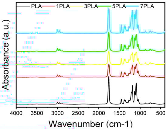 FTIR spectrum of PLA/WO3 nanocomposites with varying urchin-like WO3 particle loading (0 wt%, 1 wt%, 3 wt%, 5 wt%, and 7 wt%).