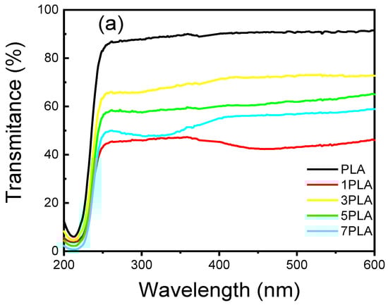 The UV-absorbance and UV-blocking capabilities of PLA/WO3 nanocomposites are essential for applications where light sensitivity can compromise the shelf life and quality of products []. The incorporation of the urchin-like WO3 particles into the PLA matrix significantly modifies the optical properties of the nanocomposites, as shown in Figure 7a. With the addition of WO3 particles, the UV-Vis transmittance of the nanocomposites decreases notably compared to neat PLA. This reduction is primarily due to the enhanced light scattering and absorption provided by the WO3 particles, which results in reduced transparency. At a wavelength of 600 nm, neat PLA exhibits a transmittance of 91%, whereas the 1 wt% PLA/WO3 nanocomposite (1PLA) shows a significantly reduced transmittance of 45%. This dramatic decrease indicates an effective distribution of the urchin-like WO3 particles within the polymer matrix, optimizing light-blocking efficiency. For the other composites, the transmittance values are 72% for 3PLA, 62% for 5PLA, and 58% for 7PLA, demonstrating an upward trend in UV-blocking capabilities with increased nanoparticle concentration (Table 1). This behavior can be attributed to the structural properties of the nanocomposites, including pore size and circularity, which influence the interaction between the matrix and incident light. The 1PLA sample, for instance, has a pore length of 14.01 µm, a pore width of 11.11 µm, and a pore circularity of 1.26, which likely contributes to its optimal light-blocking performance.