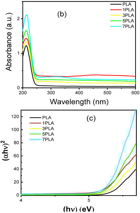 Figure 7b further illustrates that the introduction of the urchin-like WO3 particles substantially increases absorbance across the visible and UV ranges. The 1PLA sample exhibits a remarkable 45% increase in absorbance compared to neat PLA, underscoring its potential for protecting light-sensitive packaged products. The absorbance spectra reveal a significant rise in the UV region, particularly between 200 and 250 nm, which highlights the nanocomposites’ improved UV-blocking capabilities. This is likely due to the π-π* transitions in the ester groups of PLA, with the presence of WO3 particles altering electronic interactions within the matrix []. As shown in Figure 7c, the bandgap energies decrease with increasing the urchin-like WO3 particle loading: 5.39 eV for PLA, 5.15 eV for 1PLA, 5.21 eV for 3PLA, 5.22 eV for 5PLA, and 5.21 eV for 7PLA. The reduction of 0.2 eV observed for the 7 wt% WO3 particles suggests enhanced electronic coupling within the composite. This aligns with findings from Shanshool et al. [], who reported similar reductions in bandgap energies in various polymer matrices with increased nanofiller concentrations. The optical characteristics of PLA/WO3 nanocomposites, particularly their UV-blocking efficiency, make them promising candidates for applications requiring improved light protection and thermal stability. The data presented in Table 1 reinforce the importance of the urchin-like WO3 particle loadings and distribution in achieving desired optical properties, offering a pathway for tailoring nanocomposites to specific industrial needs.