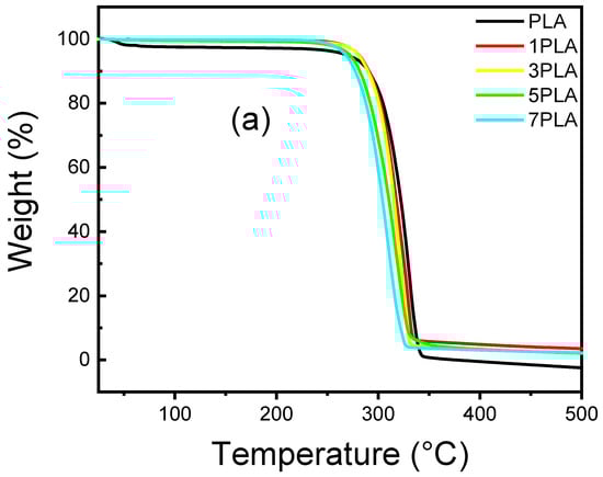 TGA analysis was used to evaluate the thermal stability of neat PLA and PLA/WO3 nanocomposites, as shown in Figure 8 and Table 2. Neat PLA exhibited an initial weight loss of 4 wt% between 40 and 120 °C, which was higher compared to PLA/WO3 nanocomposites (1.5 wt%). This reduction in early weight loss in the nanocomposites can be attributed to the porous structure facilitating more efficient solvent removal. The initial weight loss in neat PLA is likely due to residual solvents from the casting process or absorbed moisture []. Incorporating urchin-like WO3 particles significantly enhances the thermal stability of the PLA nanocomposites, with the WO3 particles functioning as reinforcing agents that limit polymer chain mobility and act as thermal barriers, thereby slowing heat transfer and reducing the risk of thermal degradation [,]. Increased WO3 particle loadings (1–5 wt%) raise the temperature at which 5%, 50%, and 95% weight loss occurs, demonstrating enhanced thermal resistance. For example, the T5% for neat PLA is 269 °C, while it rises to 281–282 °C for 1–5 wt% WO3 nanocomposites, indicating a clear improvement in thermal stability. However, at 7 wt% WO3, T5% decreases slightly to 268 °C, suggesting that excessive WO3 may compromise thermal stability. This trend is similarly reflected in the T50% values, which decrease from 322 °C for neat PLA to 304 °C for 7 wt% WO3, indicating that higher WO3 loadings may catalyze degradation by introducing defects through aggregation. The final degradation temperature (T95%) and maximum degradation rate (Tmax) also show this pattern, with T95% increasing to 389 °C for 1 wt% WO3 but dropping to 326 °C for 7 wt% WO3. Likewise, Tmax decreases from 331 °C for neat PLA to 310.4 °C for 7 wt% WO3. These findings suggest that while lower WO3 concentrations improve thermal stability, higher concentrations may initiate degradation pathways, consistent with previous findings on ZnO nanofillers in PLA by Murariu et al. [].