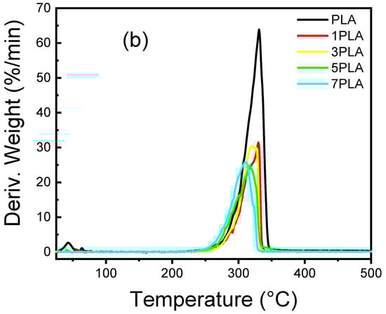 TGA curves of the neat PLA and PLA/WO3 nanocomposites: (a) Weight loss curves illustrating the thermal degradation profiles, and (b) derivative TGA (d-TGA) graphs showing the rate of weight loss as a function of temperature.
