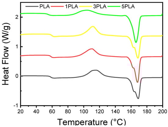 DSC scan of neat PLA and PLA/WO3 composites with different amounts of WO3 (1, 3, and 5 wt%).