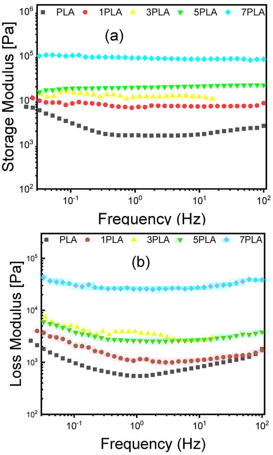 Figure 10d demonstrates that the complex viscosity of the nanocomposites exhibits pronounced shear-thinning behavior. The complex viscosity increases by a factor of 4 as the frequency decreases from 100 Hz to 0.01 Hz. For instance, at 0.1 Hz, the complex viscosity of the 1PLA is 1.3 × 104 Pa·s, while it increases to 1.58 × 105 Pa·s for the 7PLA (Table 4). This increase in complex viscosity with higher WO3 particle loading suggests enhanced network formation and consolidation within the PLA matrix. The shear-thinning behavior is characteristic of materials where the complex viscosity decreases with increasing shear rate, which is typical of gels and suspensions with a well-developed network structure. The presence of WO3 particles increases the material’s resistance to flow, contributing to a more structured and stable gel network. This effect is attributed to the interactions between the WO3 particles and polymer chains, which create a more complex internal network that affects the material’s flow behavior [].