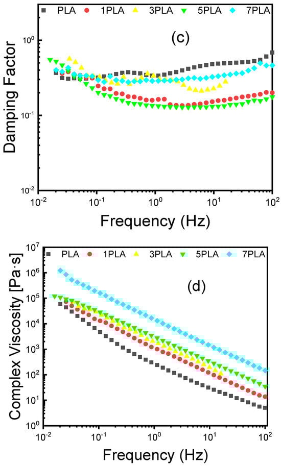 Variation of storage, loss moduli, damping factor, and complex viscosity in function of the frequency of neat PLA and PLA/WO3 nanocomposites: (a) storage modulus; (b) loss modulus; (c) damping factor; (d) complex viscosity.