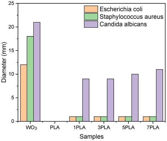 The antimicrobial efficacy of PLA/WO3 nanocomposites was tested against Escherichia coli, Staphylococcus aureus, and Candida albicans. The assay mixed 5 mL of brain heart infusion broth (BHIB) with 0.1 g of each sample: PLA/WO3 nanocomposites, net PLA, and WO3 particles. PLA and WO3 served as controls to assess their individual antimicrobial effects. PLA alone showed no inhibition, confirming its lack of inherent antimicrobial properties, while the nanocomposites demonstrated enhanced activity [,,]. This highlights the need for functional additives like WO3 particles to impart antimicrobial capabilities to PLA. However, the PLA/WO3 nanocomposites (1PLA, 3PLA, 5PLA, and 7PLA) did not exhibit inhibition zones against E. coli or S. aureus, suggesting resistance of these bacterial strains to the WO3 particles at the tested concentrations. This is consistent with Muzaffar et al. [], who also observed limited antimicrobial activity of WO3/GO nanocomposites against these bacteria.