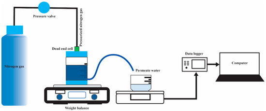 The water flux experiment was conducted for 30 min to achieve stable flux. A dead-end cell (HP4750 Stirred Cell, Sterlitech Corp., Kent, WA, USA) was used to conduct the water flux test, as depicted in Figure 2. The effective membrane area used was 14.6 cm2. During the experiment, a fixed pressure of 0.5 bar of nitrogen gas was introduced into the dead-end cell unit to maintain sufficient pressure in the pure water chamber. Throughout the process, the permeate water that passed through the tested membrane was carefully monitored and recorded using a Weighing Environment Logger (AD-1687, A&D, RoHS, Tokyo, Japan). The following equations were used to calculate the volumetric flux () and permeability flux ():