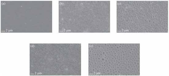 SEM micrographs on top surfaces of 20 wt.% EPS/PVP waste membranes: (a) pristine EPS, (b) EPS/PVP-2, (c) EPS/PVP-4, (d) EPS/PVP-6, and (e) EPS/PVP-8.