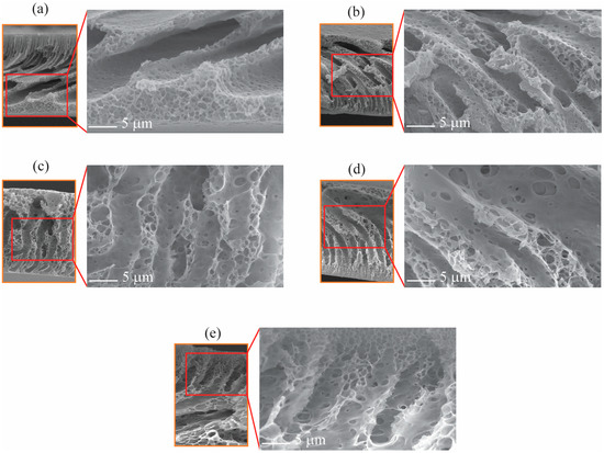 Cross-sectional SEM micrographs of 20 wt.% EPS/PVP waste membranes: (a) pristine EPS membrane, (b) EPS/PVP-2, (c) EPS/PVP-4, (d) EPS/PVP-6, and (e) EPS/PVP-8.