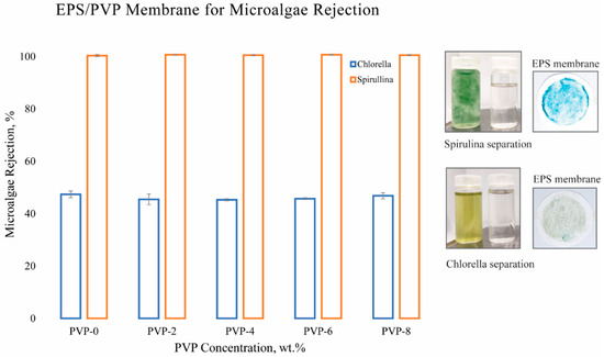 - These membranes were used to harvest microalgae, resulting in nearly complete biomass recovery for Spirulina platensis and 50% recovery for Chlorella vulgaris. The EPS/PVP-8 membrane achieved the highest water flux of 970.5 LMH/Bar, which is double that of the pristine EPS waste membrane.