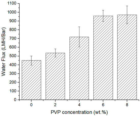 Figure 6 displays the water flux of fabricated EPS waste membranes with varying concentrations of PVP. The water flux is lowest for the pristine EPS waste membrane (449.7 LMH/Bar) and increases with increasing PVP concentration to double fold at PVP-8 (970.5 LMH/Bar), which suggests that the pore size of the pristine EPS waste membrane is the smallest amongst all the membranes. Pure water fluxes increase gradually with increasing PVP content, which is probably due to the increase in surface pore size and macrovoids. The surface SEM micrographs in Figure 3 and Figure 4 clarifies this suggestion. All membranes with PVP have larger open pores, with size and quantity increasing with PVP concentration. It can be seen that all membranes with PVP have larger wall pores, hence better water flow. According to Han and Nam [24], the addition of low-concentration PVP to a cast solution results in the enlargement of macrovoid structures and induced change in surface porosity, which then leads to improved membrane permeate flux. This alteration is attributed to PVP’s ability to enhance phase separation during demixing. Nouzaki et al. [29] observed that their polysulfone membrane became porous when using a casting solution containing PVP as an additive. From this work, they concluded that water-soluble PVP created islands within the membrane during formation, leading to an increase in pore size.