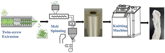 Different ratios of PA56, EMA (0.5–10.0 wt%), and PPGS (0.5–10.0 wt%) were mixed and added to a twin-screw extruder to yield blend chips. Subsequently, the blend chips were dried in a vacuum drum dryer at 105 °C for 8 h to reduce the moisture content to approximately 400 ppm. Antimicrobial PA56 pre-oriented yarn (POY) was obtained by melt spinning using a TITA Machinery spinning machine with a spinneret containing 36 holes, at a take-up speed of 4200 m/min and a spinning temperature of 285 °C. The diameters of the fibres were controlled by adjusting the flow rate of a metering pump.
