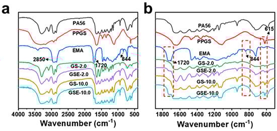 FTIR spectroscopy was used to investigate the molecular structures of PA56, EMA, and PPGS. As shown in Figure 2, the characteristic peak of the –CH3 groups is observed at 2850 cm−1. The peak at 1720 cm−1 is attributed to the C=O stretching vibration absorption of ester groups that at 844 cm−1 is ascribed to the epoxy groups in EMA [34,35].