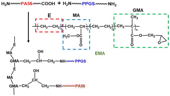 The sharp peak at 615 cm−1 is attributed to the bending vibrations of –SO42−, confirming the presence of PPGS in the modified PA56 fibres. Compared with the spectrum of the blend fibres, different bands are observed in the spectrum of copolymerised fibres (Figure 2b). The peak at 1720 cm−1 is attributed to EMA addition. However, the absorption peak of the EMA epoxy groups at 844 cm−1 is not observed in the spectrum of GSE-2.0, indicating that the epoxy groups of EMA participated in the chemical reaction [36,37,38]. Even when the dosage of EMA is increased to 10 wt%, epoxy groups are not observed in the FTIR spectrum of GSE-10.0. The FTIR spectroscopy results confirm the successful bonding of EMA and PPGS to the PA56 macromolecules. The in situ compatibilisation mechanism is depicted in Figure 3.