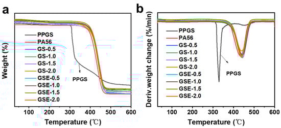 TGA was used to investigate the effects of PPGS and EMA on the thermal stability of PA56. The weight and derivative weight change curves, as shown in Figure 5, show the similar trends of modified PA56 samples. The thermal parameters extracted from Figure 5 are shown in Table 2. Compared to PA56 with an onset decomposition temperature (T5%) of 381.5 °C, the T5% of the modified samples decreases with increasing PPGS content, which can be ascribed to the lower decomposition temperature of PPGS than PA56. The T5% of the samples with EMA are 5–10 °C higher than those of the PPGS blend samples, which may be attributed to the chemical bonding effects during processing. The typical processing temperature of PA56 is approximately 280 °C; thus, the addition of small amounts of PPGS is not expected to significantly affect its processability.