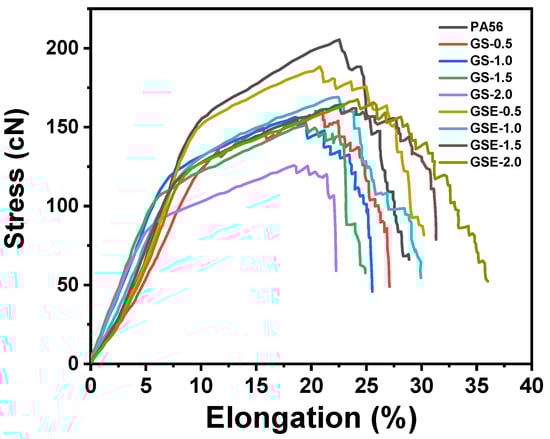 The elongation at break of the PA56 DTY fibres increased continuously with increasing EMA content, compared with PA56 fibres, the elongation at break of GSE-2.0 was increased by 25.93%. The epoxy groups in the molecular chains of the GSE fibres can react with the amine groups, increasing the compatibility between PA56, EMA, and PPGS. In contrast, EMA toughening agents can help form crazes and shear bands in the material [39,41,42]. Compared with fibres containing only PPGS, EMA toughening agents improve the compatibility of the blend samples, effectively absorbing stress and reducing stress concentration points inside the material, thereby enhancing the mechanical properties of the material.