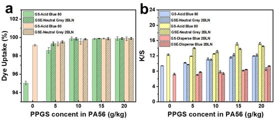 Dispersed dyes are extensively applied to PA textiles, which can diffuse in the noncrystalline regions of the fibres and interact mainly through van der Waals forces, especially hydrogen bonds [45,46]. The UV absorbance of the Disperse Blue 2BLN solution was difficult to measure because of the nonsolubility of the dye in water. The dye uptake also can be analysed based on K/S values, whereby the dye uptake and K/S value are positively correlated. As shown in Figure 5b, the PPGS and EMA addition slightly increased the K/S values of the samples, which can be ascribed to the addition of some polar groups that contribute to fibre and dispersed dye binding [47].