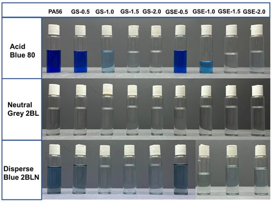 To determine the effects of the PPMG content on the wash fastness of the dyes, washing tests were conducted according to ISO 105-C10 (2006) standard. Figure 8 shows photographs of the residual liquid after washing the dyed samples with a soap solution. The colour intensity of the residual liquid from washing the fibres dyed with Acid Blue 80 decreases as the PPMG content increases from 0.5 to 2.0 wt%, indicating an increase in colour fastness. The abundant amino groups provided by PPMG are considered to contribute to the wash fastness. In contrast, for the fibres dyed with Neutral Grey 2BL and Disperse Blue 2BLN, PPMG has minimal effects on the wash fastness. The wash fastness values for all samples are above level 4, which meets the requirements for industrial production.