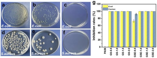 Typical antibacterial photographs of (a,d) PA56, (b,e) GSE-0.5, and (c,f) GS-0.5. (g) Inhibition rates of the fibres against E. coli and S. aureus.