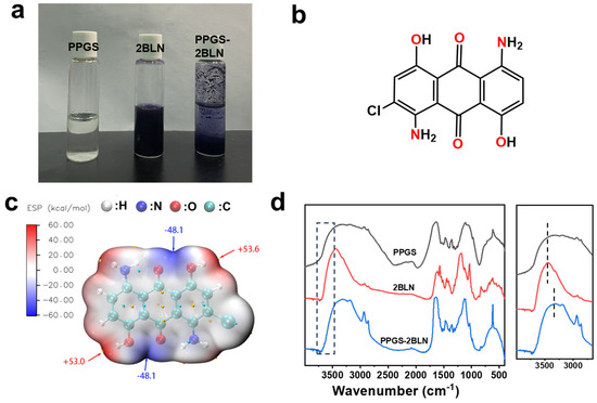 (a) Photograph of PPGS and Disperse Blue 2BLN solutions. (b) Chemical structure and (c) molecular electrostatic potential map of Disperse Blue 2BLN. (d) FTIR spectra of PPGS and Disperse Blue 2BLN.