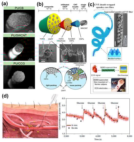 (a) SEM images of wet-spun composite fibers: PU/CB, PU/SWCNT, and PU/CCG []. (b) Composite structure containing CNTs, where each fiber is composed of multiple bundles, with each bundle consisting of thousands of individual CNTs []. (c) Highly twisted CNT fiber with first-coils and supercoils, along with their applications []. (d) Injection process of the fiber sensor into a blood vessel for monitoring biological signals [].