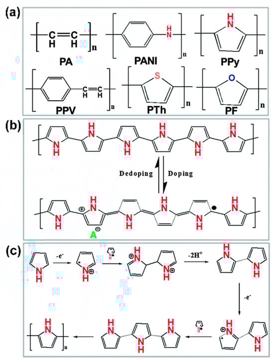 (a) Chemical structures of typical conductive polymers. (b) Doping and dedoping process of PPy. (c) Schematic of the polymerization mechanism of PPy [].