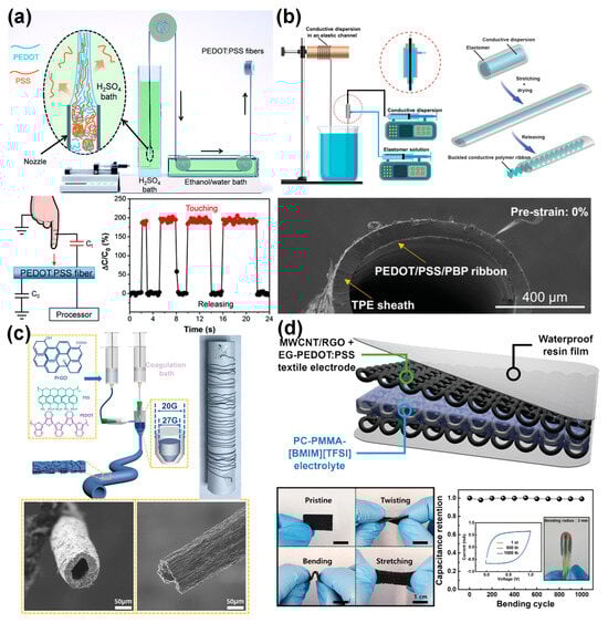 (a) Schematic of the modified setup for wet-spinning PEDOT:PSS fibers and their application []. (b) Coaxial wet-spinning process to encapsulate conductive dispersion in an elastic TPE channel, with an SEM image of the coaxial fiber []. (c) Schematic of the HCFs fabrication process, including the cross-sectional and side-view SEM images of HCFs-50 []. (d) Schematic of the stretchable spandex/nylon fabric coated with the highly conductive polymer PEDOT:PSS [].