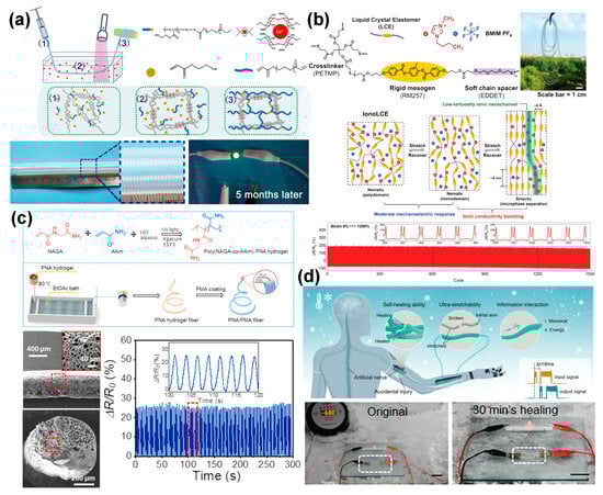 (a) Schematic of the molecular design and evolution of organohydrogel fibers, with photographs of a long single fiber collected onto a continuously winding drum spool and an LED powered directly by this fiber []. (b) Molecular structures of IonoLCE, composed of ionic liquid and LCE network, and the working mechanism for ion transport modulation, along with real-time resistance changes of this fiber under 1500 cycles []. (c) Preparation of PNA/PMA core–sheath fibers, including SEM images of the fiber and its cycling stability as a strain sensor []. (d) Ionic fibers with frost resistance for applications in artificial nerve, demonstrating electrical self-healing capacity at −68 °C [].