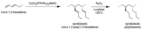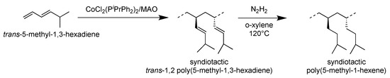 - Boccia, A.C.; Leone, G.; Boglia, A.; Ricci, G. Novel Stereoregular cis-1,4 and trans-1,2 Poly(diene)s: Synthesis, Characterization, and Mechanistic Considerations. Polymer 2013, 54, 3492–3503. [Google Scholar] [CrossRef]