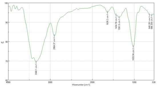 FTIR analysis was performed using an ORIGIN JASCO FT/IR-4100 Type A spectrometer: JASCO Corporation, Tokyo, Japan. The spectra were obtained in the range of 4000 to 550 cm−1, with a resolution of 4 cm−1 and 64 scans per sample. The samples were prepared using the KBr pellet technique. The resulting spectra were compared with a high-purity (>99%) cotton cellulose standard to identify the characteristic cellulose bands and to evaluate the effectiveness of the extraction process.