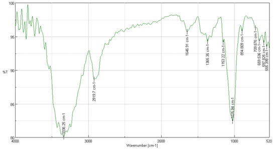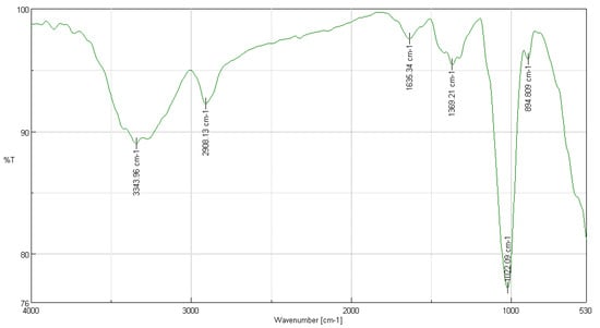 The peak at 3336 cm−1 indicates the presence of hydroxyl groups (-OH), typical in cellulose structures, showing a transmission of 70%, similar to the 69.2824% observed in the cotton sample. This suggests a well-preserved cellulose structure. The peak at 2918 cm−1 (assigned to 2904.27 cm−1 in our sample) with a transmission of 85%, compared to 82.9496% in cotton, corresponds to the C-H stretching of methyl and methylene groups, confirming the structural similarity to cotton cellulose in terms of basic carbon–hydrogen components [].