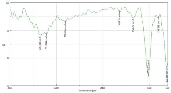 In the FTIR analysis of Vallea stipularis L. f. shown in Figure 3, several significant peaks were observed that evidence the molecular structure of cellulose. The peak at 3351.68 cm−1, with a transmittance of 97.36%, is associated with hydroxyl group (-OH) stretching, indicating strong intramolecular hydrogen bonds essential for the cellulose structure. At 3216.68 cm−1, with a transmittance of 97.70%, intermolecular hydrogen bonds critical for the structural integrity of cellulose are observed. The peak at 2803.99 cm−1 reflects C-H stretching, indicating the presence of methyl and methylene groups []. At 1639.2 cm−1, a peak associated with O-H bending due to adsorbed water shows a common property in natural cellulose samples. The peak at 1346.07 cm−1, indicative of C-H bending, and the one at 1018.23 cm−1, suggesting C-O stretching and ring stretching modes, are fundamental to the cellulose structure. Additionally, at 798.385 cm−1, a linkage to the beta bond of cellulose is observed, and at 620.966 cm−1, CH2 rocking vibrations are present. Both reflect crucial structural components in cellulose, corroborating the high purity and proper structure of the cellulose extracted from Vallea stipularis L. f. [].