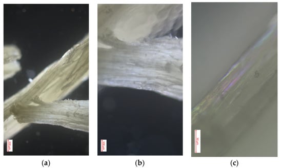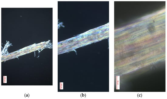 Optimal optical microscopy with polarized light performed on cellulose extracted from the species Cedrela montana Moritz ex Turcz: (a) image with 10× magnification in microscopy; (b) image with 40× magnification in microscopy; (c) image with 100× magnification in microscopy.