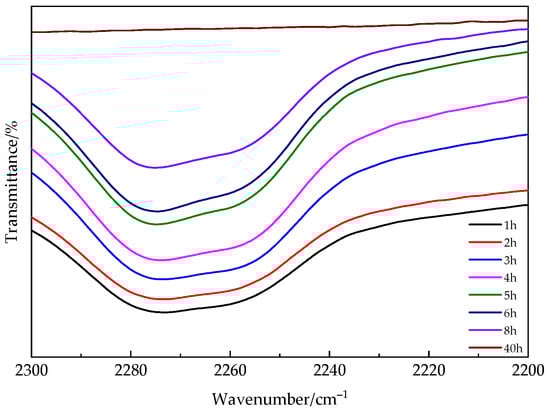 We also investigated the variation of the peak value of isocyanate functional groups over time through infrared spectroscopy. In Figure 3, the peak absorption of NCO functional groups decreases over time and nearly disappears after approximately 40 h. The requirement for an extended reaction time can be attributed to the internal diffusion process in the later stage of the curing reaction, which results in a low reaction rate.
