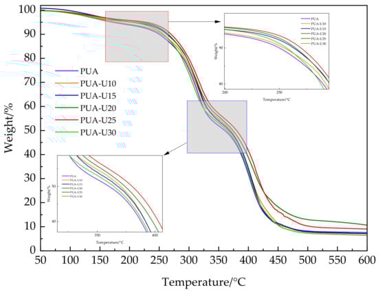 Thermal stability is another critical factor that affects the performance of the coating film. Figure 4 presents thermogravimetric analysis data indicating that under a nitrogen atmosphere, both PUA and urushiol-modified PUA samples exhibited slight mass loss at temperatures below 200 °C, predominantly attributed to the volatilization of minute moisture content and residual solvents within the samples. The PUA material is composed of distinct hard and soft segment architectures, which undergo thermal degradation in two separate temperature intervals [28]. The first stage (250–330 °C) of weight loss is attributed to the cleavage of the urea bonds in the hard segments due to decomposition reactions. The second stage of weight loss, which occurs between 330 and 480 °C, is caused by the degradation of the soft segments. The modification with urushiol can increase the decomposition temperature, which may be due to the reaction of phenolic hydroxyl groups in urushiol with isocyanate groups, forming a highly cross-linking network structure that enhances the thermal stability of the film. When the proportion of urushiol exceeds 30%, there is a downward trend in the decomposition temperature of both stages, possibly due to phase separation caused by excessive addition, which is consistent with the mechanical performance and chemical resistance of the film. The thermogravimetric curve is consistent with the typical thermal degradation trend of typical polyurethane materials [29,30]. The results of the thermogravimetric test indicate that the urushiol-modified PUA has excellent heat resistance, aging characteristics, and stable high-temperature performance.