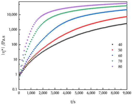 The time-dependent isothermal viscosity curve |η*| (color-coded mark) of the PUA-U25 system in the thermal range of 40–80 °C.