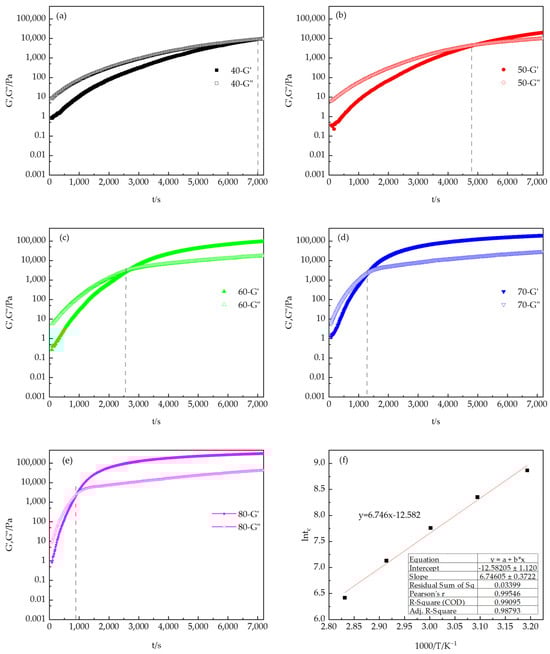 Variation of the dynamic moduli (G′ and G″, color-coded mark) with the reaction time of the PUA-U25 system during curing at different temperatures: (a–e) represent 40 °C to 80 °C, respectively, and (f) represents the Arrhenius expression of tc as a reciprocal temperature function (the gel point at tc was determined at the G′ and G″ crossover).