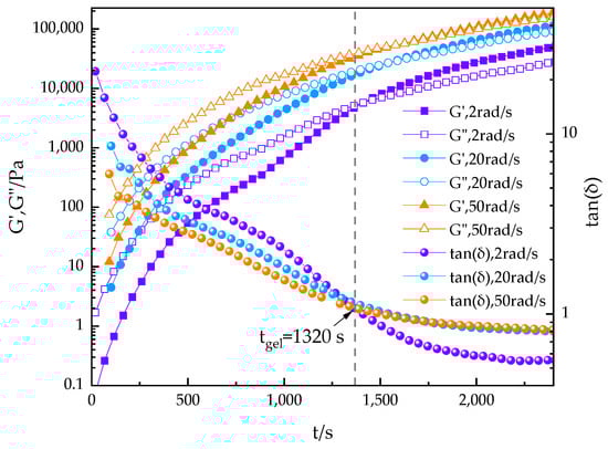 Here, n is the relaxation exponent, which depends on the molecular structure and details [43]. Through time-scan experiments at multiple oscillatory frequencies of 2, 20, and 50 rad/s, we determined the gel time tgel at 70 °C. Since tanδ is independent of frequency at the gel point, the curve passes through a specific point, clearly defining the gel state. The experimental results show that the gel time (tgel) is 1320 s.