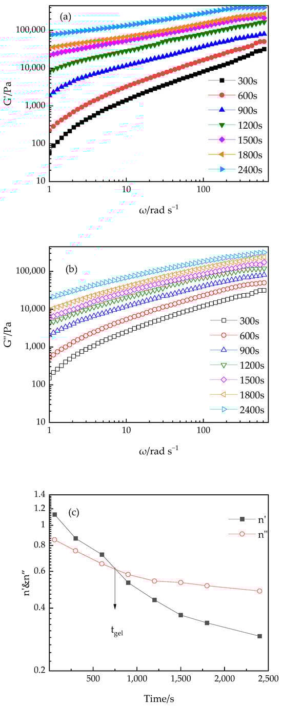The variation of G′ and G″ with angular frequency can be described by the power-law relationship of Equation (2), which is applicable throughout the entire frequency range. Exponents n′ and n″ are determined by the slopes of the G′ and G″ versus ω plots, and these exponent values are related to the gelation time. Figure 9c illustrates the time-dependent behavior of n′ and n″ at 70 °C. Both exponents decrease exponentially over time and converge at the gel point; that is, at tgel, n′ = n″ = 0.61. The experimental results reveal that the values of nslope and ntan are very close, confirming the correctness of the theoretical expectations. This phenomenon indicates that the estimated n-value remains stable under different temperature conditions. More importantly, the n is consistent with the value of 2/3 predicted by percolation theory [45], providing strong experimental support for the theoretical model.