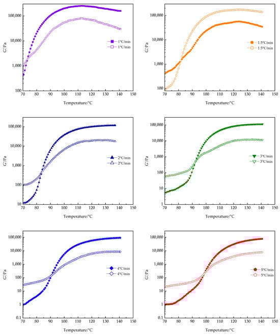 The trends of the storage modulus (G′) and loss modulus (G″) at different heating rates are shown in Figure 10. At the initial stage of the curing reaction, G′ remains less than G″. As the temperature rises, the curing reaction accelerates, causing G′ to increase rapidly and eventually surpass G″, which signifies the formation of the cross-linking network and the gelation of the system. When G′ is greater than G″, the system primarily exhibits elastic properties, consistent with the progressive development of the isothermal cross-linking structure. Furthermore, the gelation time (tgel) decreases with an increase in the heating rate, and the gelation point shifts to a higher temperature, a phenomenon that is consistent with the observations of other researchers [46,47]. The decrease in gelation time is attributed to the rapid local cross-linking of the PUA-U25 system at high temperatures and fast heating rates, where the network structure inhibits the diffusion of unreacted small molecules. This is consistent with the reaction characteristics observed in isothermal curing processes, where higher curing temperatures lead to a shorter time to reach gelation.