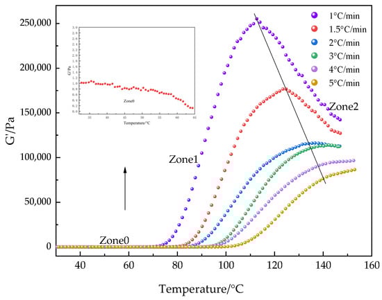 To describe the relationship between storage modulus and temperature, Figure 11 illustrates the whole process of how G′ changes with temperature. We can see that the entire process is divided into three regions. In Zone 0, there is an initial decrease in the storage modulus, while the rapid increase in the storage modulus in Zone 1 signifies the beginning of the curing process for thermosetting materials. The decrease in the storage modulus in Zone 2 indicates the completion of the curing process. Since the effect of temperature on the storage modulus is minor in the initial stage, the influence of temperature on the storage modulus can be neglected during this phase. In the final stage, after the curing process is completed, the increase in temperature at a low heating rate leads to a significant decrease in the storage modulus. This impact can be quantified by Equation (4), which defines the relationship between the increase in temperature and the decrease in the storage modulus [12,48,49], expressed as:
