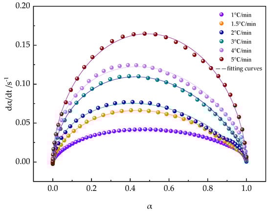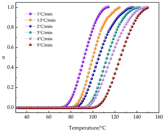 Figure 12, representing Equation (5), illustrates the degree of conversion at various heating rates. It is evident that during the initial stages of curing, the increase in all α values is very gradual. After reaching a certain extent, the reaction is triggered, and the degree of curing increases rapidly, then gradually approaches a certain value.