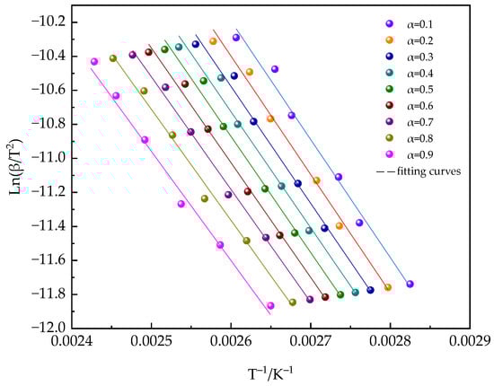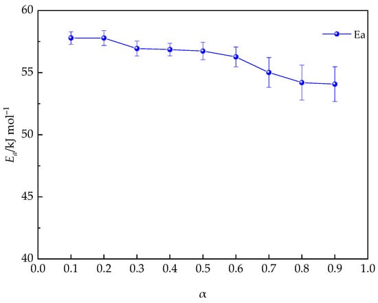 The determination of Eα is crucial in the study of the curing reaction kinetics. The equivalent transformation method of differential and integral equations provides the primary means for determining Eα [54,55,56,57,58]. This paper uses the integral method proposed by Kissinger–Akahira–Sunose (KAS) to study the deviation of Eα, thereby gaining a deeper understanding of the kinetic characteristics during the curing process of the material. The mathematical expression of the KAS method is shown in Equation (8):