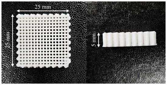 A PCL filament (eMate PCL, eSUN, Shenzhen, China) was prepared as the polymer matrix for 3D printing and MCP. PCL molecular weights range from 3000 to 90,000 g/mol [,]. PCL is semi-crystalline, biodegradable, and biocompatible with a density of 1.16 g/cm3, a glass transition temperature (Tg) of 213 K, and a melting temperature (Tm) of 333 K. Since it can be used as a material for medical devices and biodegradable implants through three-dimensional (3D) printing, the MCP was applied to 3D printed specimens. Given that each individual’s organs and internal structures are different, 3D printing was employed to create optimally shaped medical devices that are precisely designed to perform their intended functions. A 3D printer (X1-Carbon Combo; Bambu Lab, Shenzhen, China) was used to make a sample specimen (Figure 1). The parameters of 3D printing are below. The nozzle and bed temperatures are 443 K and 313 K. The nozzle diameter is 0.4 mm, with a printing speed of 15 mm/s. The layer thickness is 0.25 mm. The infill pattern was set to a 50% grid pattern to absorb gas faster than the solid type of PCL. In the MCP, CO2 (99.9%; 40 L; Samheung GasTech, Seoul, Republic of Korea) was utilized as a blowing agent to ensure stable saturation and high solubility.